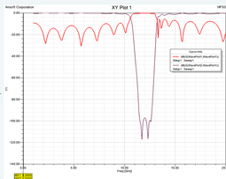 根據(jù)前面的分析,采用支線式結(jié)構(gòu)設計濾波器能夠滿足15%阻帶帶寬的要求,根據(jù)阻帶衰減要求,取n=10,采用RT/durold®6002陶瓷板作為基板,相對于微帶線來說,懸置帶線能夠減小損耗,能夠獲得更加優(yōu)越的過渡帶特性。在ADS中建立原理圖,給出各短截線及主線的初值并優(yōu)化,從而得到帶阻濾波器的各結(jié)構(gòu)參數(shù)的較準確的值,在此基礎之上,采用Ansoft公司的三維電磁場仿真軟件HFSS建立三維模型,進行參數(shù)掃描或者優(yōu)化,確定參數(shù)的精確值,得到滿足指標要求的仿真曲線,如圖3所示,阻帶衰減大于45dB的范圍約為16%,通帶插損不大于2.0dB,滿足設計指標的要求。這樣,既利用了原理圖設計的簡單性及快速性,又利用了三維電磁場仿真的準確性,從而可以快速而準確的設計出所需要的濾波器電路。